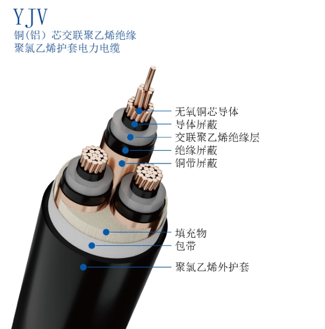 字母含義:YJ:交聯(lián)聚乙烯絕緣;V:聚氯乙烯護套;L:鋁導(dǎo)體(銅導(dǎo)體省略)